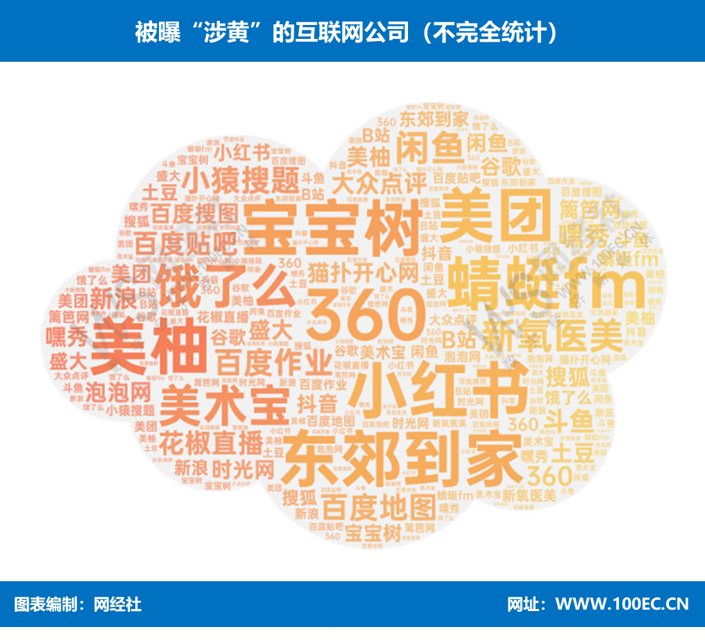 据网经社不完全统计,近几年来涉黄的平台还包括美柚、宝宝树、东郊到家、蜻蜓FM、饿了么、美术宝、新氧医美、闲鱼、小猿搜题、百度作业、百度地图、花椒直播、贴吧、嘿秀、斗鱼、大众点评、新浪、猫扑开心网、百度搜图、盛大、搜狐、土豆、泡泡网、360、时光网、篱笆网、谷歌等。