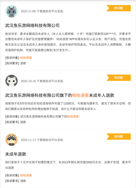 在黑猫投诉平台,也有家长发帖称咕咕语音存在未成年人保护及充值管理漏洞和退款难等问题。