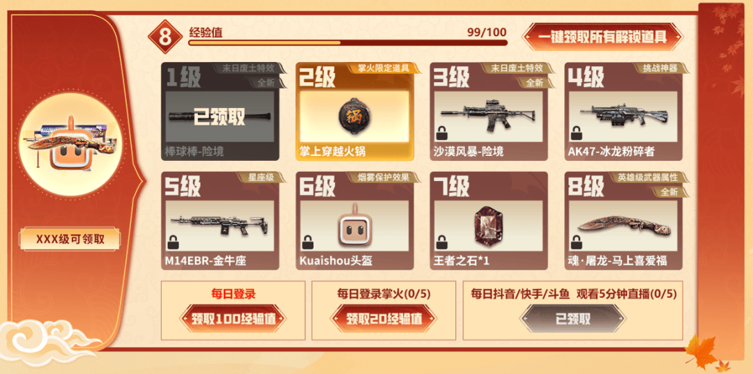核心道具奖励:魂·屠龙-马上喜爱福、棒球棒-险境、掌上穿越火锅、沙漠风暴-险境、AK47-冰龙粉碎者、M14EBR-金牛座、Kuaishou头盔、王者之石。