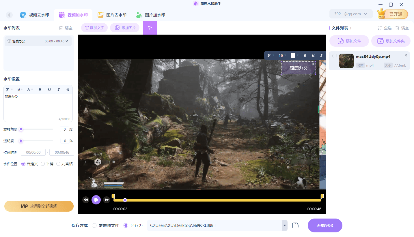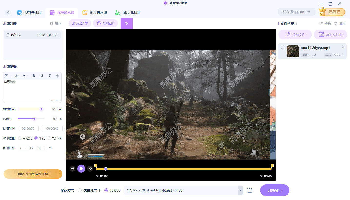 当您对视频中的水印效果感到满意后,点击“开始导出”按钮。选择保存路径和输出格式(如果是视频,则通常是MP4或其他常见格式)。